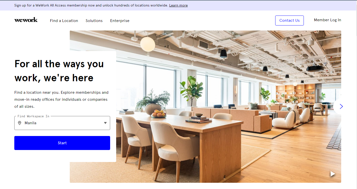 WeWork uses Squarespace's Mercer template, which features their brand's colors and showcasing their offices around the globe with stunning visuals.